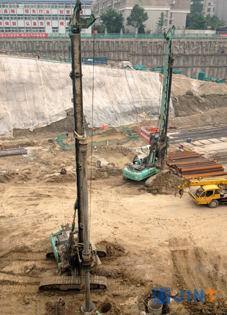 这是北京燕翔饭店改扩建工地,3台上海金泰SD12旋挖钻机运作不息,为这座超五星级酒店按时完工进行桩基础施工。SD12是上海金泰工程机械有限公司研制的小型旋挖钻机产品,自2007年上市以来累计制造销售近100台,由于其整机操作灵活、施工效率高、维护方便,深受国内外用户青睐和好评,在各类市政工程、工民建等的中小型桩基础施工中发挥着主力军作用,展示着上海金泰产品品质和企业的实力。