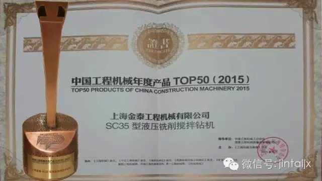 近日 “2015工程机械产品发展(北京)论坛暨中国工程机械年度产品TOP50颁奖典礼”在北京隆重举行。上海金泰SC35液压搅拌钻机在“技术创新、市场表现、应用贡献”等多维度得到专家一致认同,荣获本年度TOP50桩工机械产品奖。这是自2006年“TOP50”活动开展以来,上海金泰连续九届蝉联此殊荣,也由此成为桩工领域的“大满贯”企业。