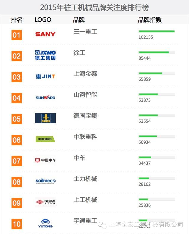 新年伊始,中国工程机械电商网和路面机械网和在北京发布了《2015中国工程机械用户品牌关注度排行榜》。这是继2009年该榜单首次亮相以来第八年推出。上海金泰工程机械有限公司荣获2015中国桩工机械用户品牌关注度十强。