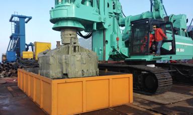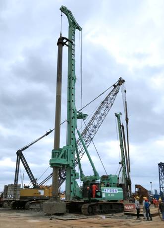 工程现场负责人上海广联环境岩土工程股份有限公司项目经理张辉介绍,该工程的地质条件和工况环境十分特殊,在实际施工中需下放直径2.8米、42米长的钢护筒,护筒深入水下土层达38米深。为保证成孔质量和施工效率,上海广联选用了金泰的SH46型大扭矩旋挖钻机施工。