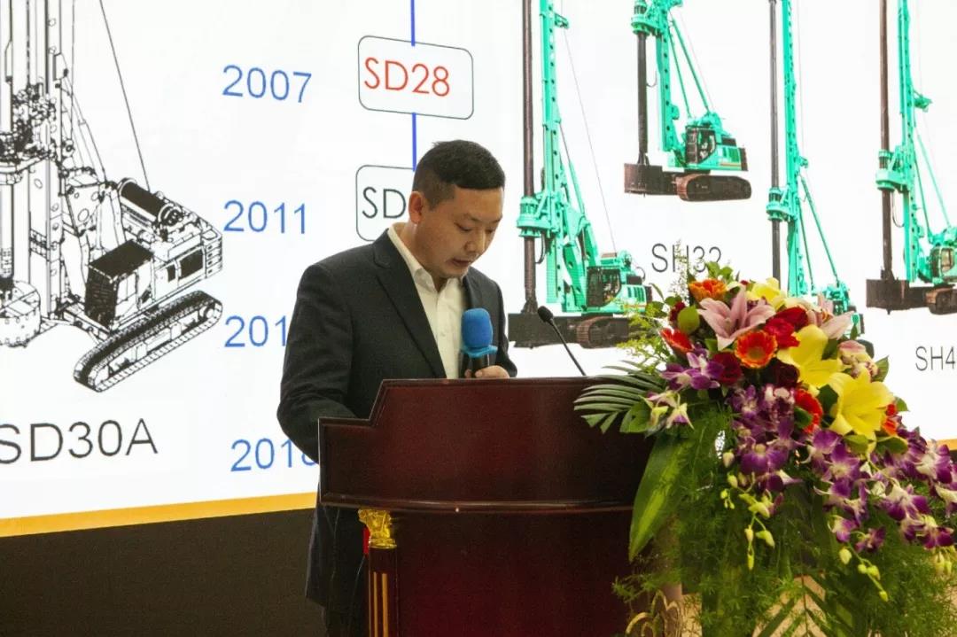 上海金泰副总经理营销公司总经理徐峰先生在会议致辞中提到:“上海金泰作为国内桩工行业历史最悠久、产品门类最齐全、综合能力最强的专业地下施工机械制造企业,已有60多年的发展历史。在这漫长的过程中,与在座的各位一起见证了我们国家改革开放取得的成果,同时创造了很多行业的第一,在80年代,我们成功研发制造了中国第一台工程钻机,在90年代中期,在金泰诞生了中国第一台中外合资生产的旋挖钻机和第一台液压连续墙抓斗,同时也研发生产出了中国第一台SMW工法钻机,进入21世纪,又先后研发生产了中国第一台双轮铣、双轮搅拌钻机。尤其在近年来,我们在技术研发、产品创新、市场拓展方面都取得了一系列的长足发展和成绩,我们始终不会忘记,金泰每一步的发展,都离不开广大客户的信任与支持。”