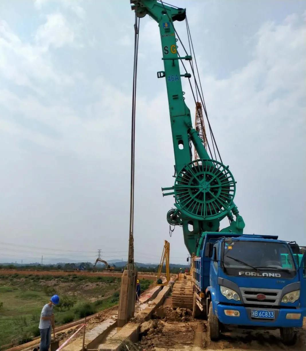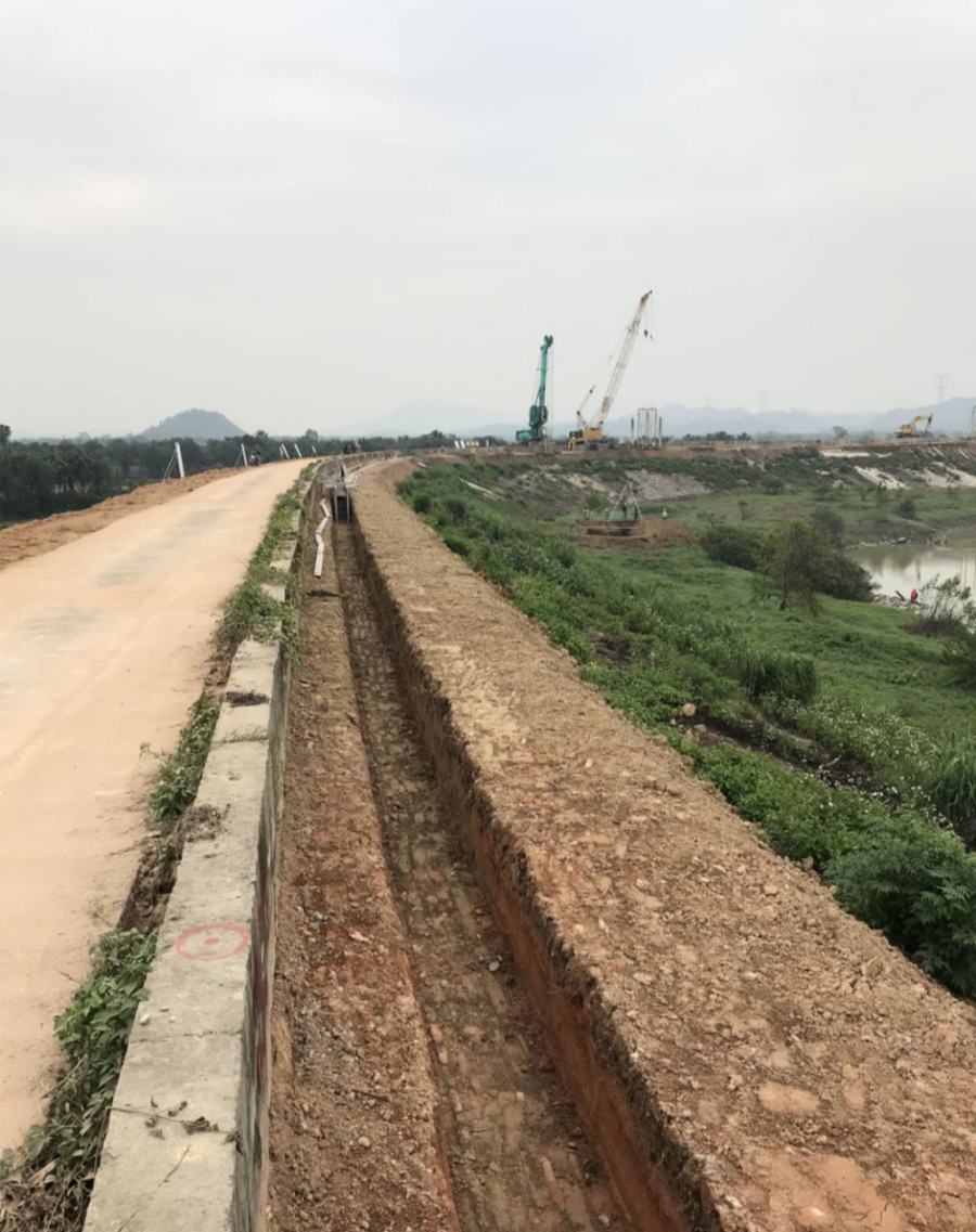 据广州峻业公司王经理介绍,“本项目施工最大难点在于堤围顶部宽度仅约5米难以满足设备施工需求,同时标段施工现场内有3条高压线及1条低压线影响工程施工。