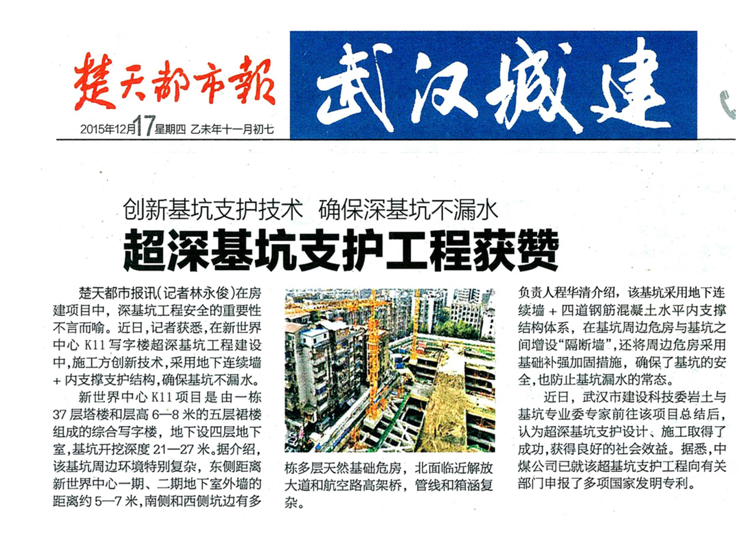 湖北中煤建设工程有限公司副总工程师李佳林在案例分享中提到:“金泰抓斗是我们腾飞的翅膀!武汉新世界中心K11——危房环境下的超深基坑支护工程在十分特殊严峻环境下,为了确保基坑及周边环境的安全,我公司采取了“墙撑”、“隔断墙”、“危房加固”及三轴搅拌桩帷幕止水、深井降水等技术措施,该项目被某著名地质大学列为岩土工程专业研究生的实习教材。