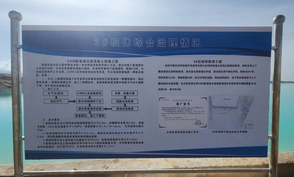 此次青海省德令哈市“动态平衡生态环保提升改造项目”,原3#拦挡坝堤基础坝体采用土工膜+连续高压旋喷桩防渗工艺,迎水面采用浆砌石护坡,背水面采用干砌石护坡,坝体长641米,坝体顶宽12.5米,坝基宽58米,经过对坝体加固,实现坝体结构稳定。在施工监测中发现高压旋喷桩与土工膜连接处出现明显渗漏,经再次考察论证后,施工方案改为目前“在坝顶采用CSM防渗技术修筑防渗墙“,为防治水土流失,减轻坝体压力,保障坝体安全,设计院在3#坝体背水侧修建了4米深的截水沟和2座集水井。